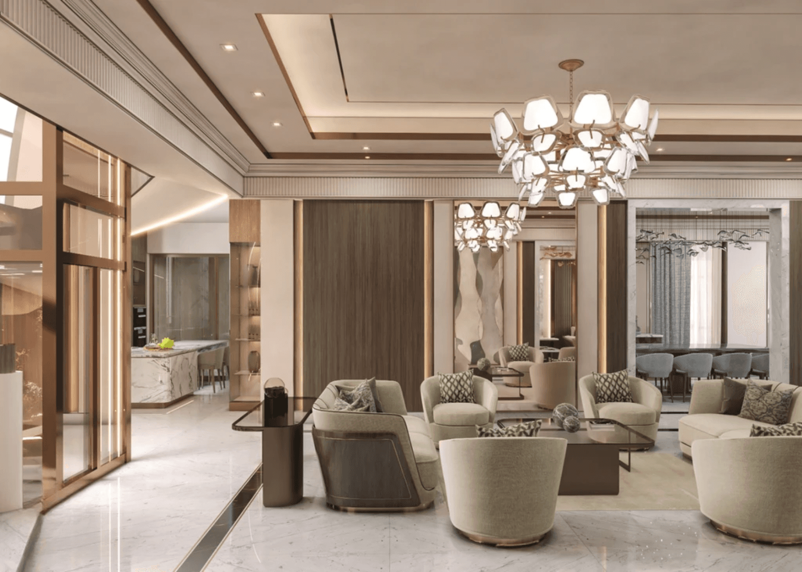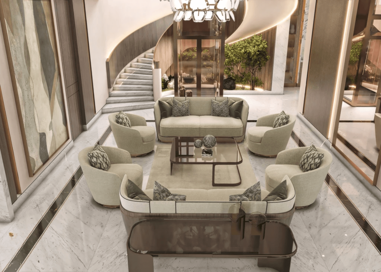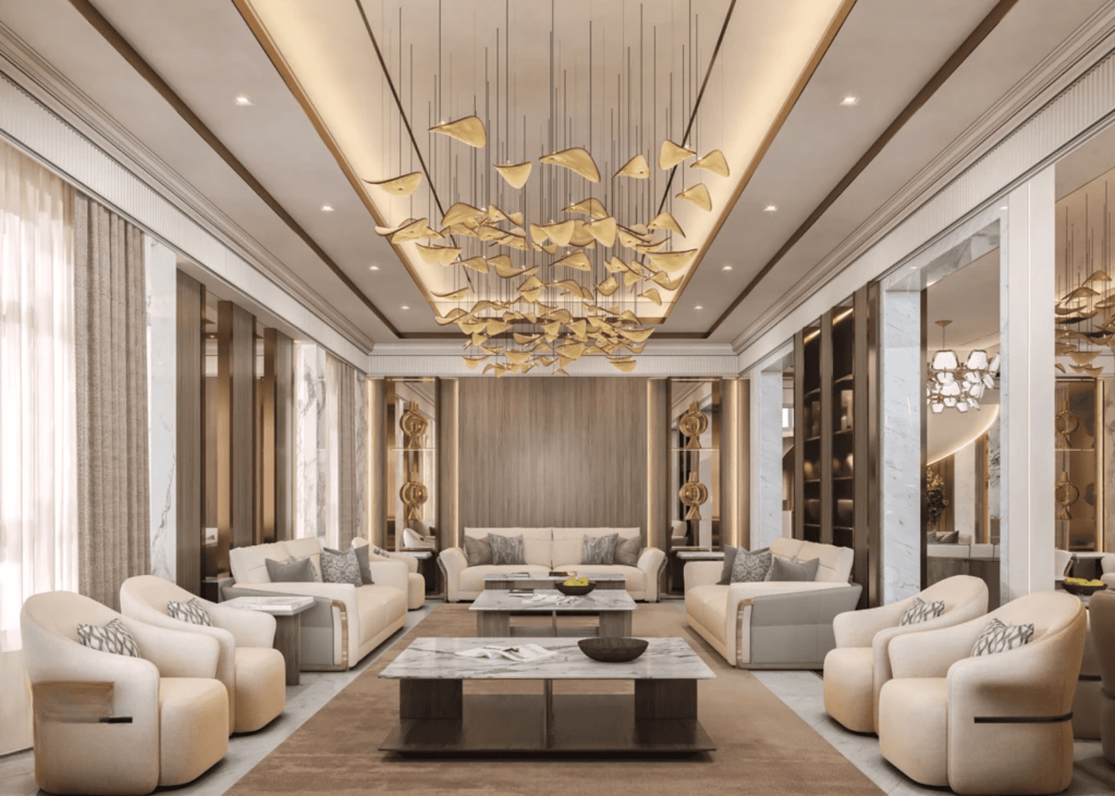 Plush sofas and armchairs are positioned around marble coffee tables, creating a balanced and comfortable seating composition. The arrangement allows smooth circulation while preserving a sense of luxury and formality.