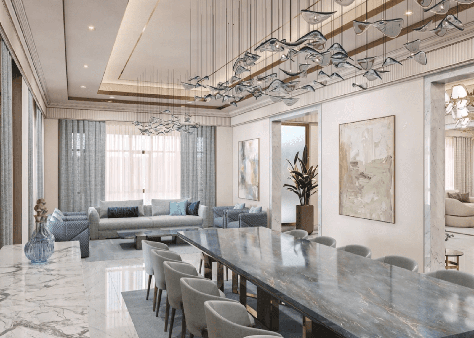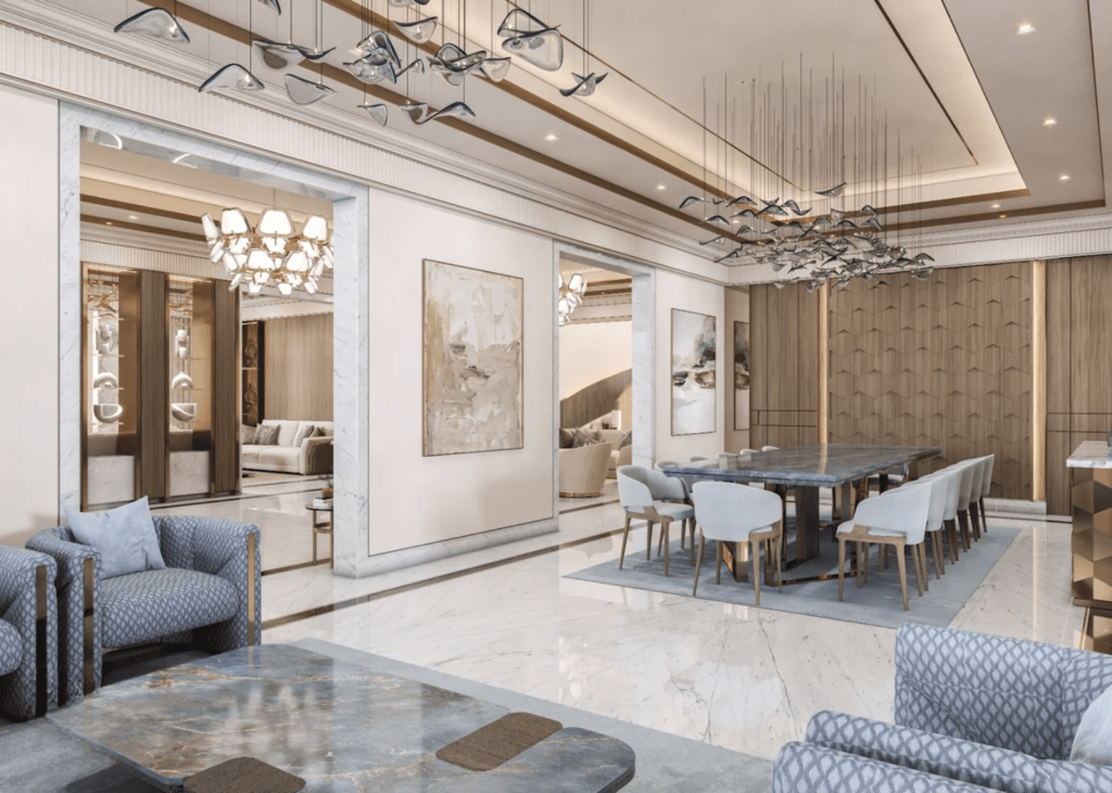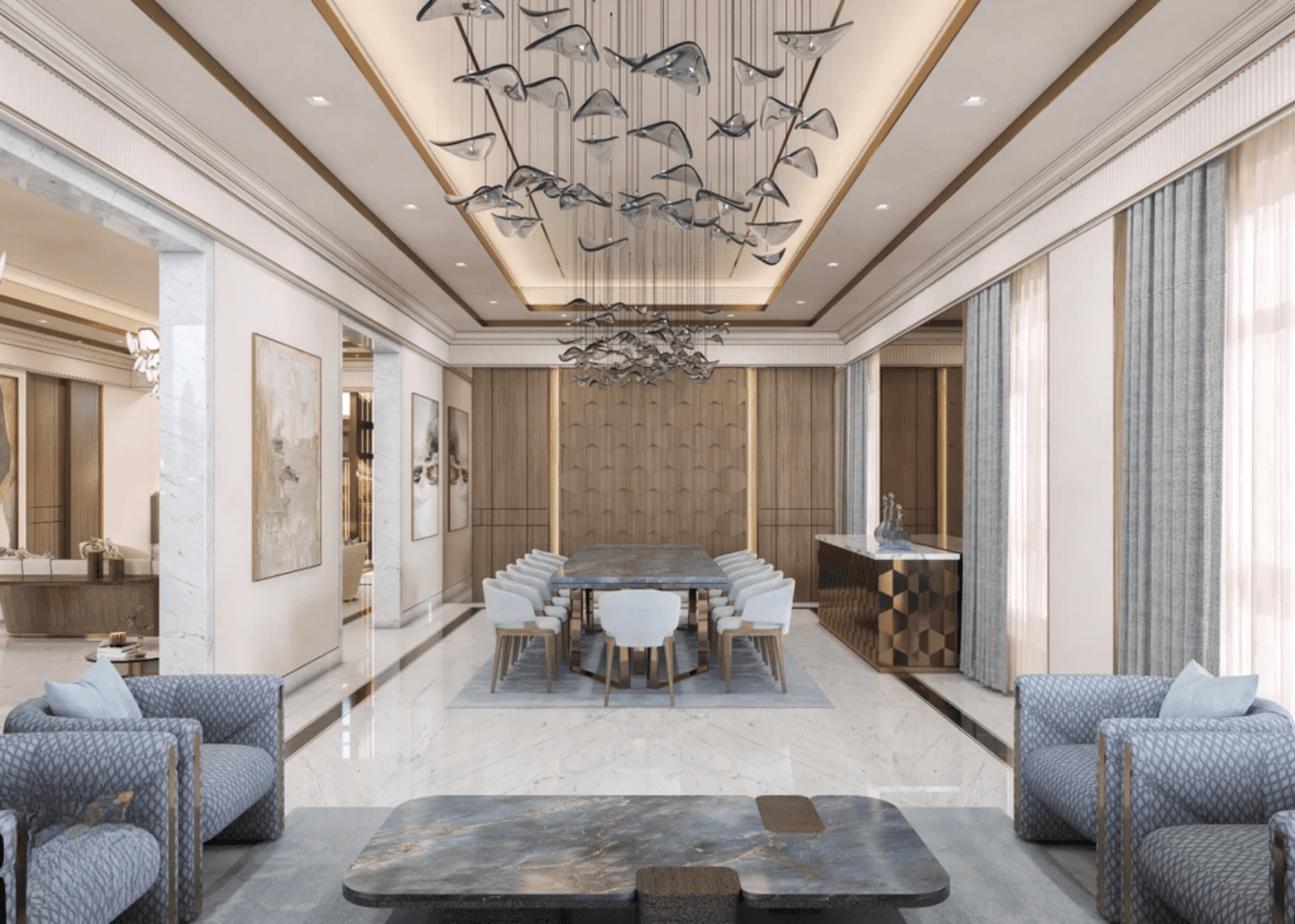 Plush sofas and armchairs are positioned around marble coffee tables, creating a balanced and comfortable seating composition. The arrangement allows smooth circulation while preserving a sense of luxury and formality.