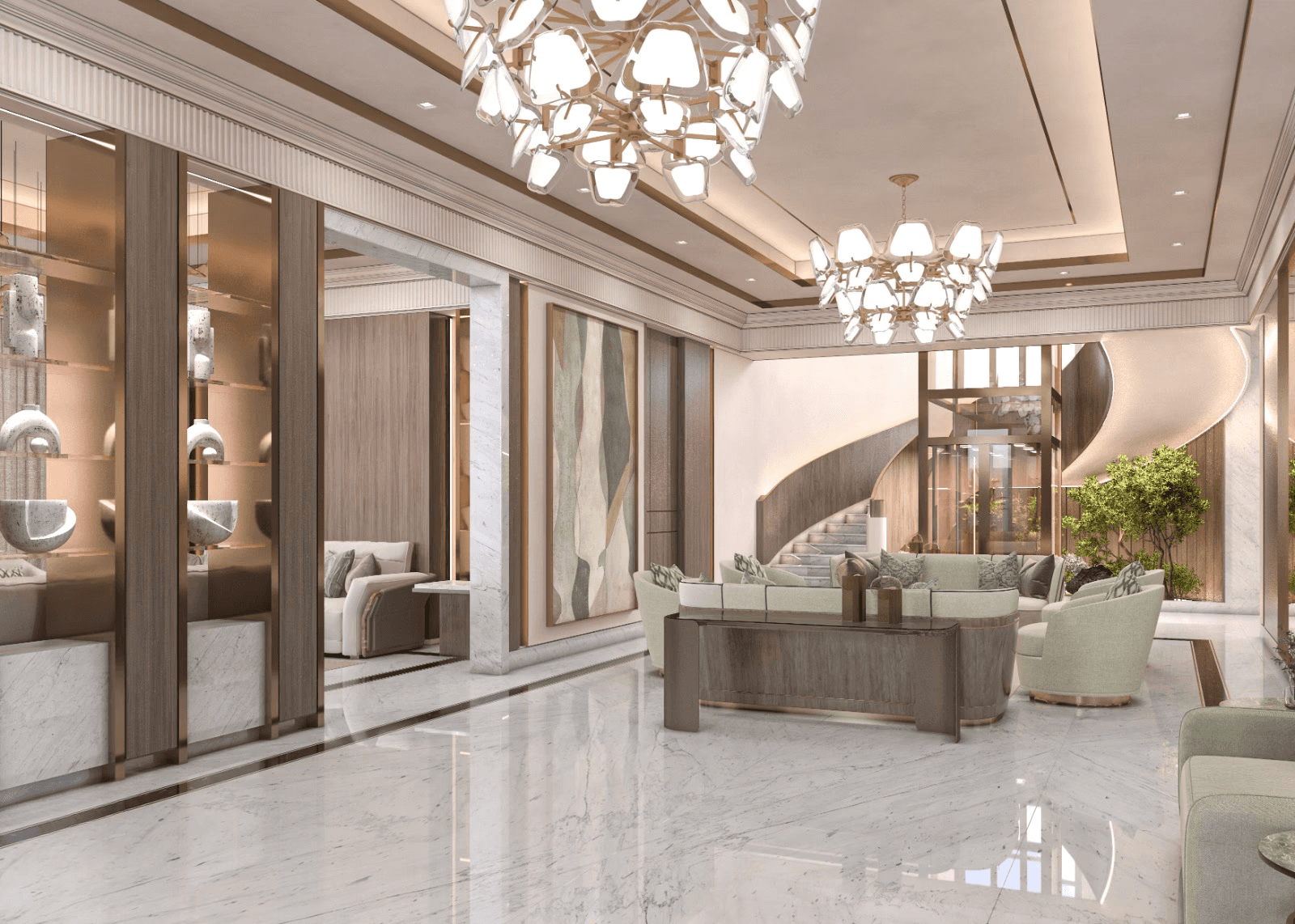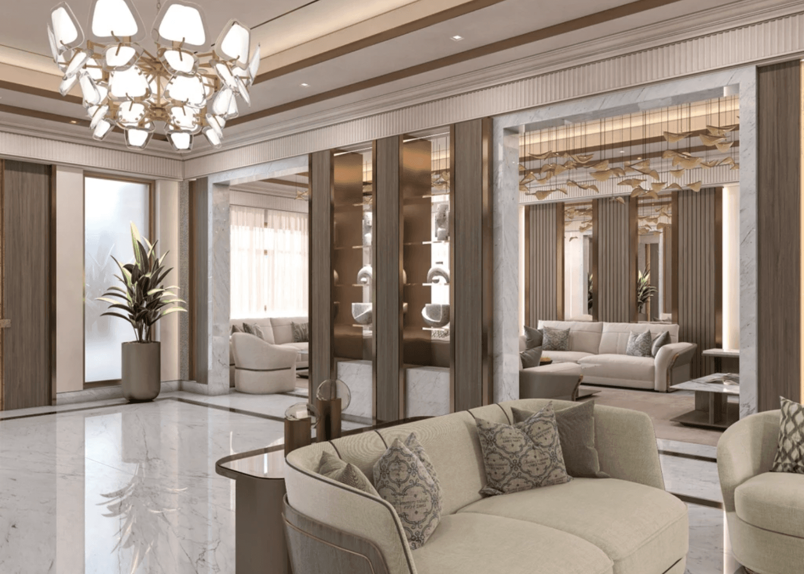 A refined feature wall with integrated shelving and decorative accents anchors the space. Vertical architectural elements and mirrors enhance depth and reflect light, adding to the overall grandeur of the living area.