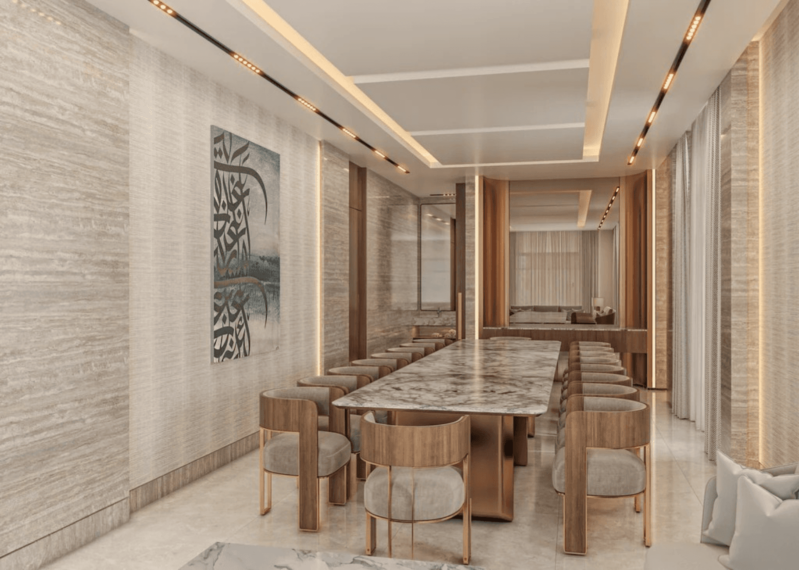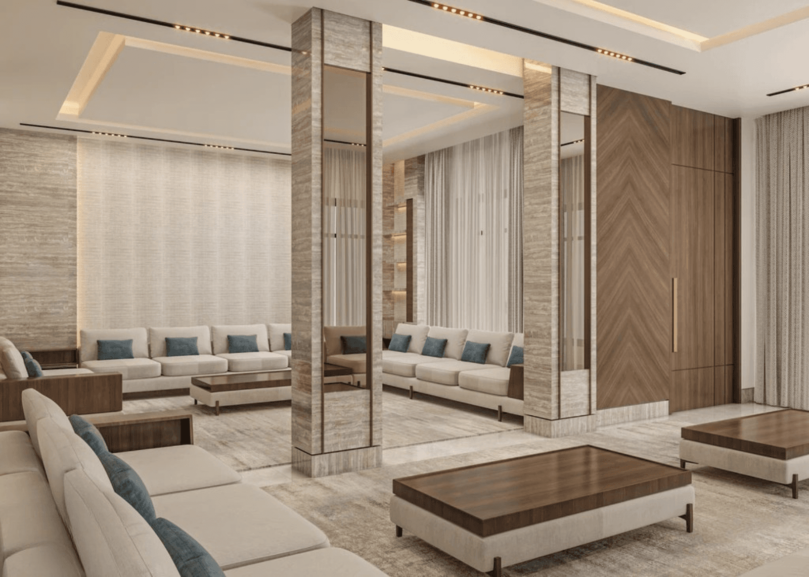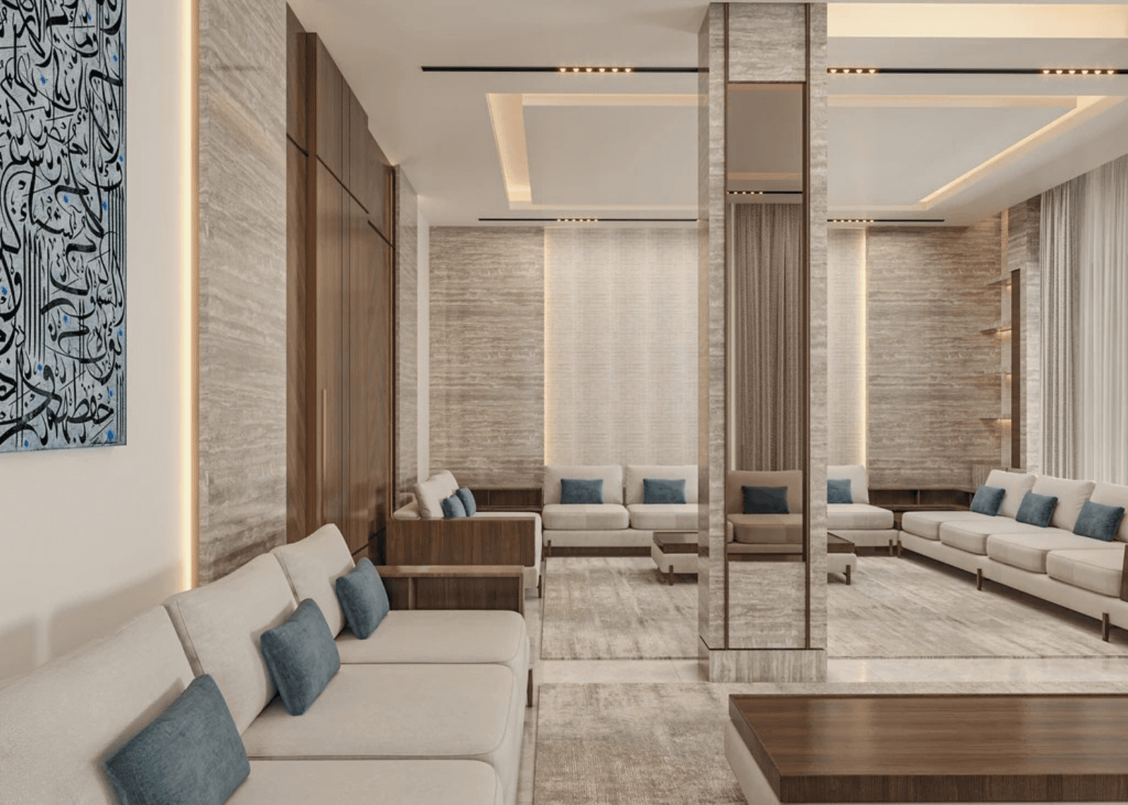 The main seating area is designed as a formal majlis-style space, suitable for meetings, discussions, and guest reception. The linear seating arrangement creates a structured layout while maintaining openness and ease of movement.