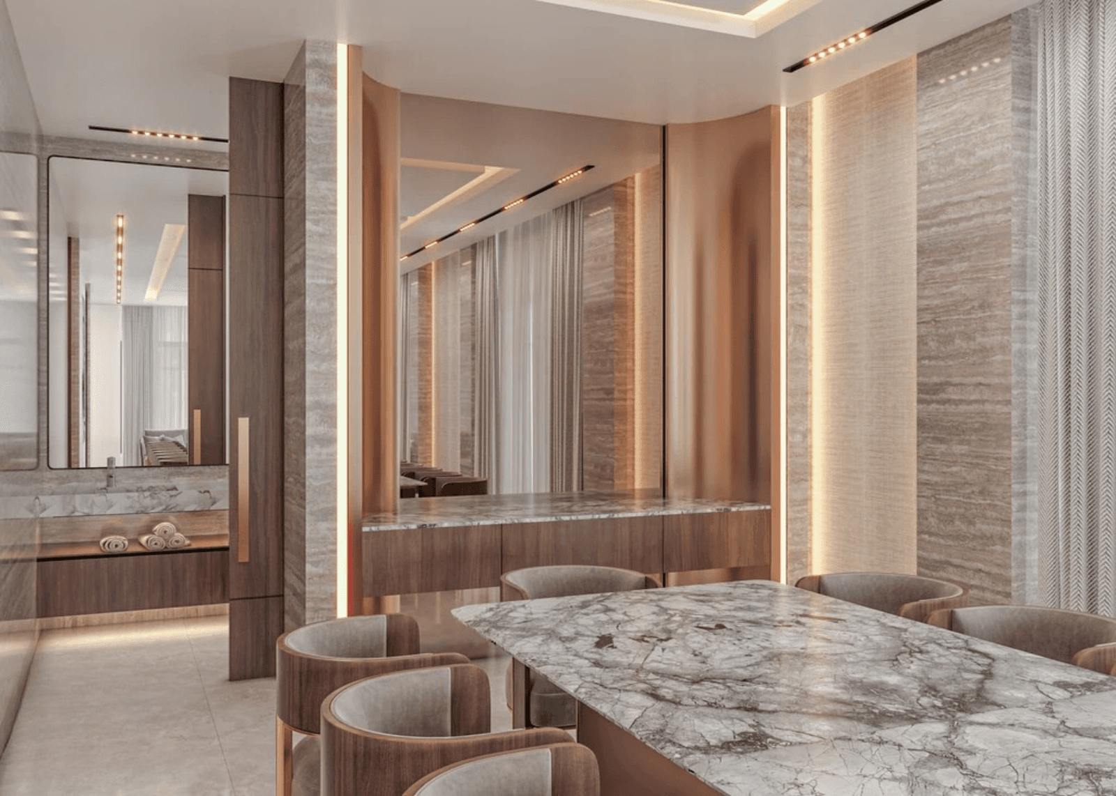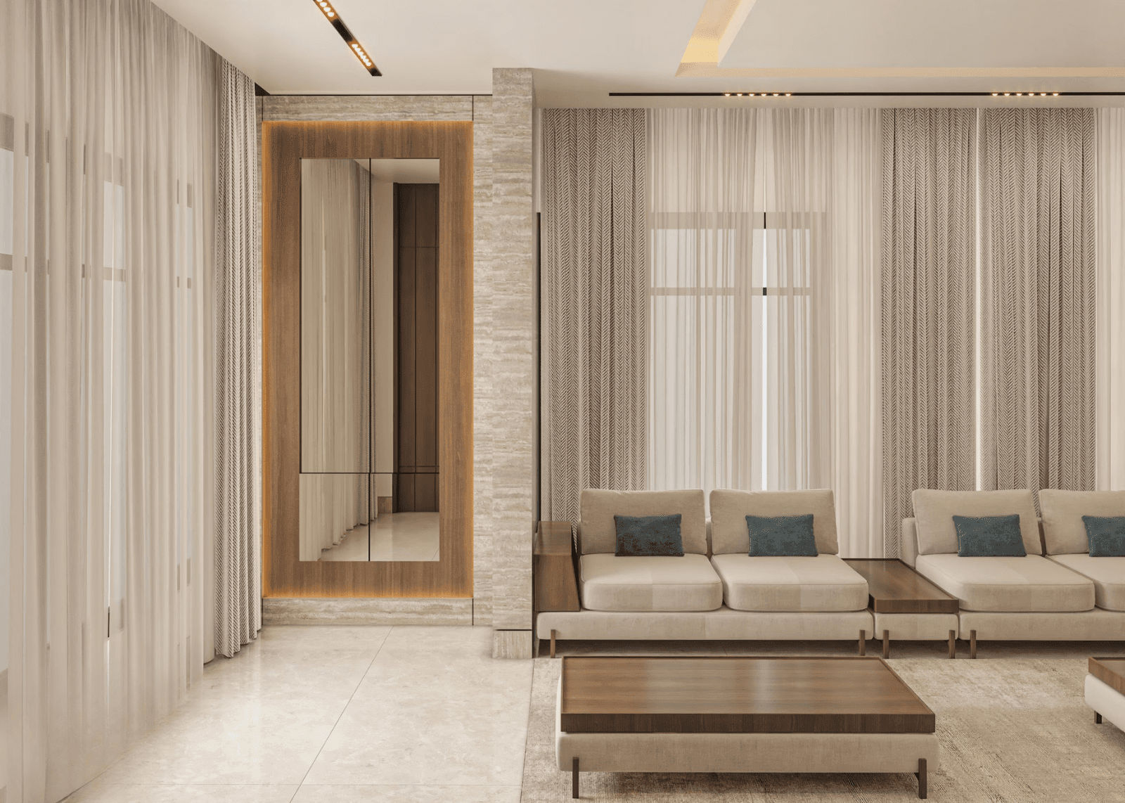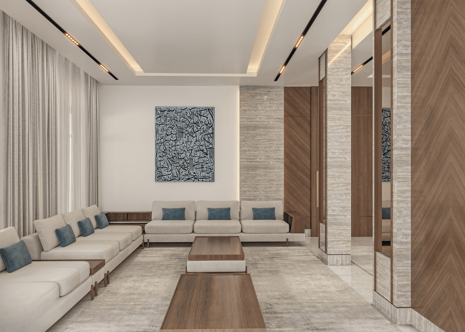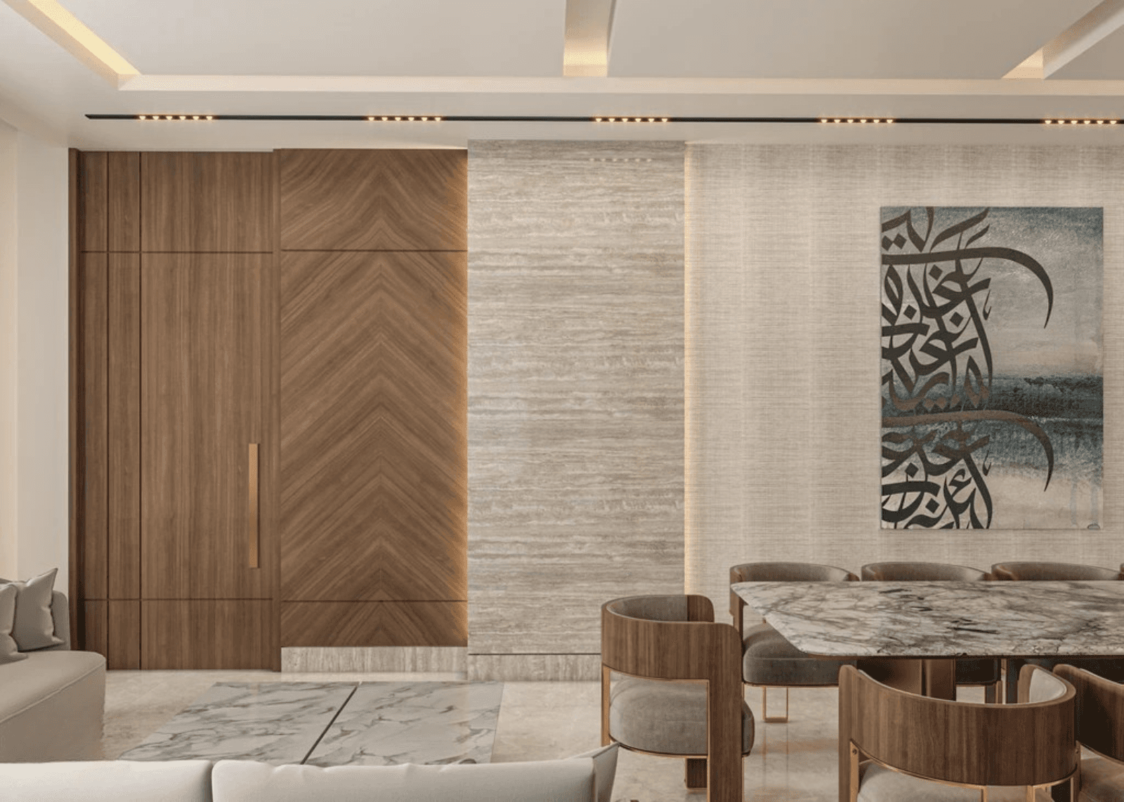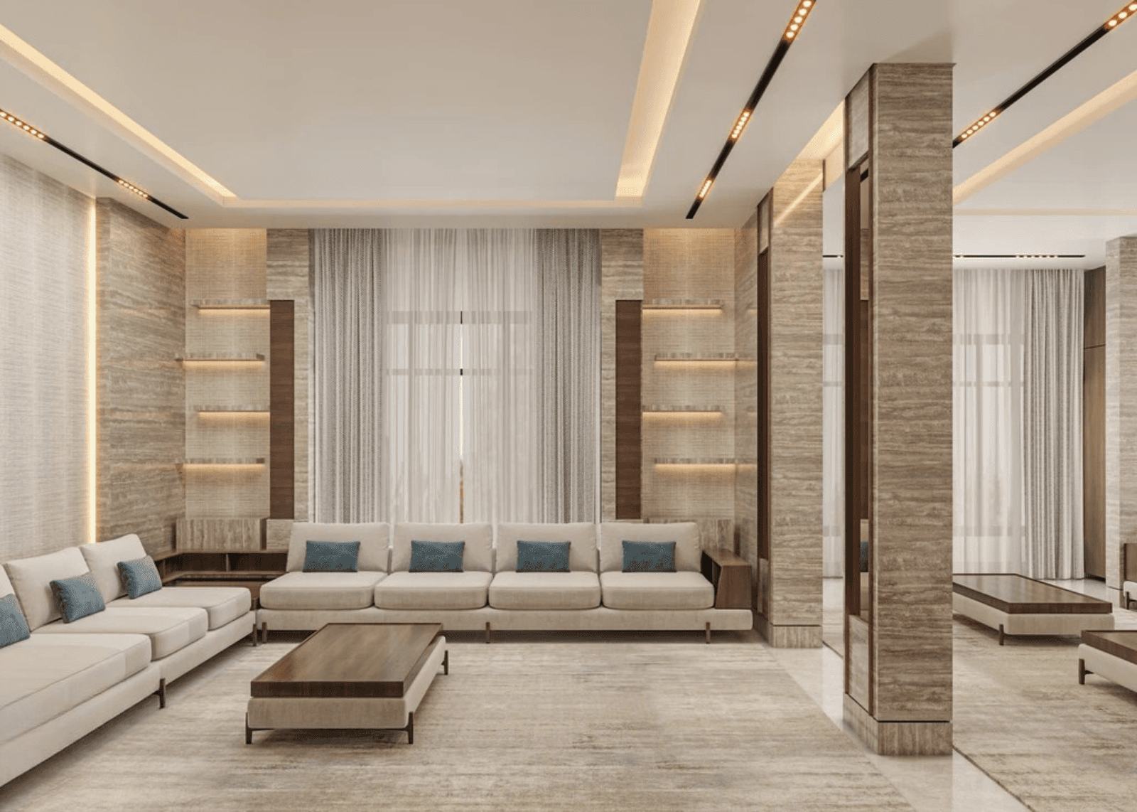Recessed ceiling lighting and concealed LED strips are used to create even illumination. Accent lighting highlights architectural details and enhances the overall ambiance without glare.
