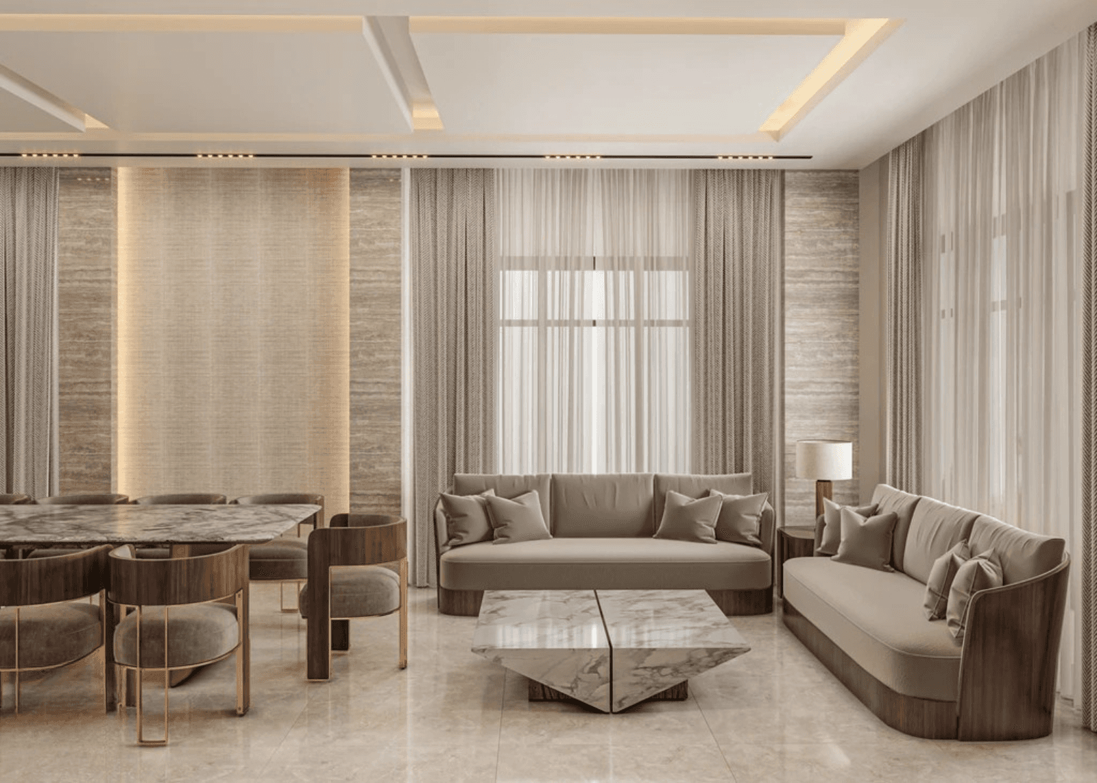 Natural stone finishes, smooth wall surfaces, and fabric-upholstered seating are used throughout the space. Textured curtains and area rugs add warmth and acoustic comfort.